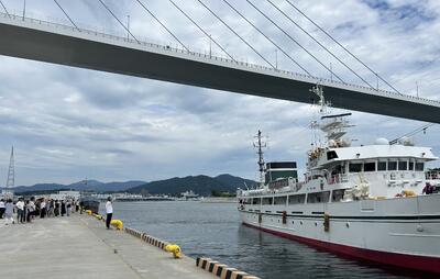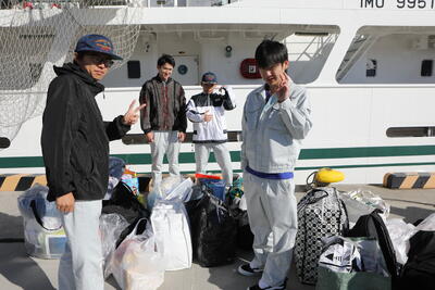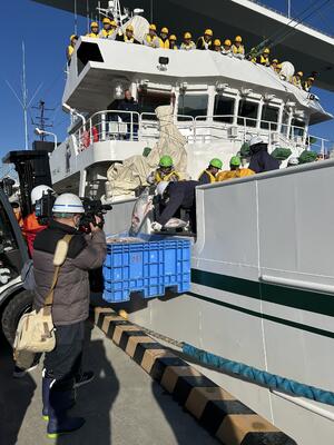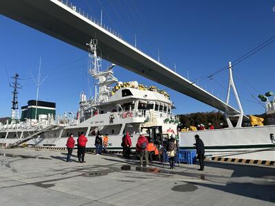 入港後には実習で漁獲したマグロなどの水揚作業を行い、続いて下船式を実施。すべての実習を終え、実習生は久しぶりの家族との再会に笑顔があふれていました。今後、在校生や教職員は、実習で得た知識や体験を聞けることを楽しみにしています。