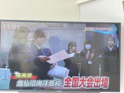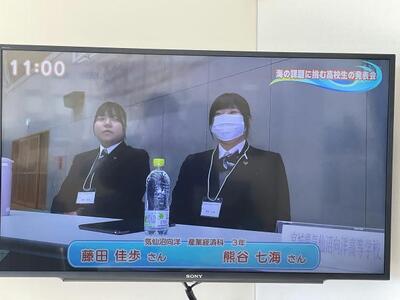 宮城水産高校と気仙沼向洋高校の取り組みを中心に放送され、本大会で優秀賞(第2位)を受賞し、全国大会への出場が決まった産業経済科3年、藤田佳歩さん、熊谷七海さんの発表も紹介されました。