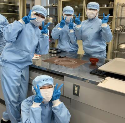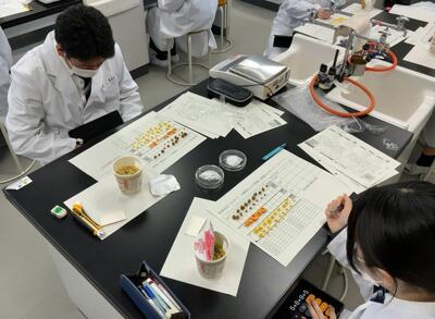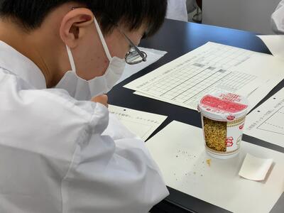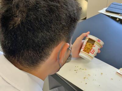 実験班は、「カップラーメン」の解剖を行いました。製造工程などを学んだ後に、容器に観察用の窓を開けて内部構造や乾燥具材の観察を行いました。表示や関係法令、知的財産についてより深く学ぶことができました。