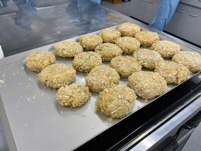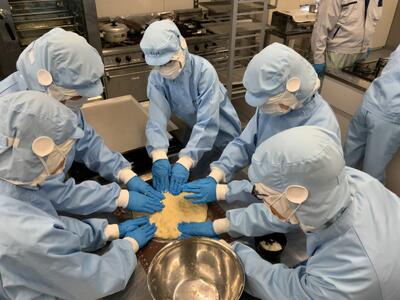 工場班は、気仙沼産サメ肉を使用したサメンチを一から手作りしたバンズ(パン)にはさんだ「サメンチバーガー」を製造しました。発酵した生地を成形する作業では、なれた手つきで生地を丸めていました。バンズの焼き具合やサメンチの揚げ具合もよく、とてもおいしそうな「サメンチバーガー」ができました。