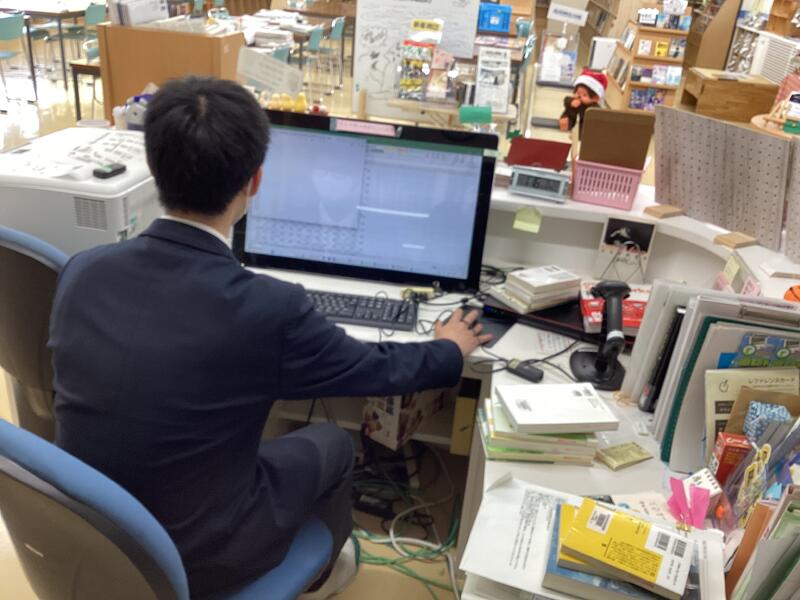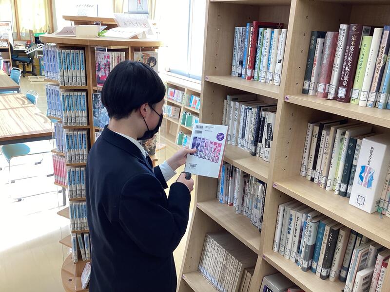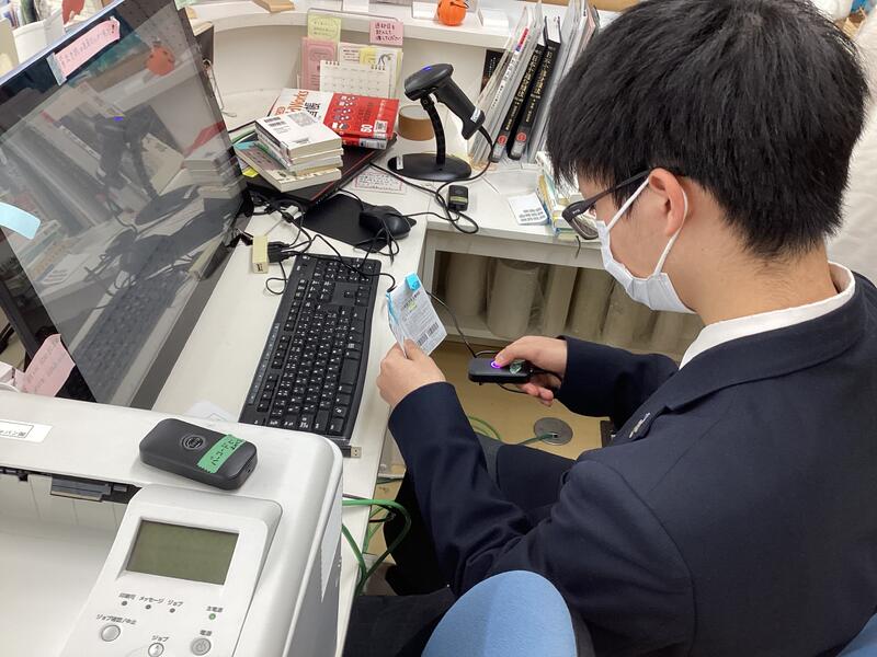 作業としてはバーコードリーダーを使って本に貼ってあるバーコードを読み込みます。その後、パソコンで番号を照合し、登録状況を確認します。