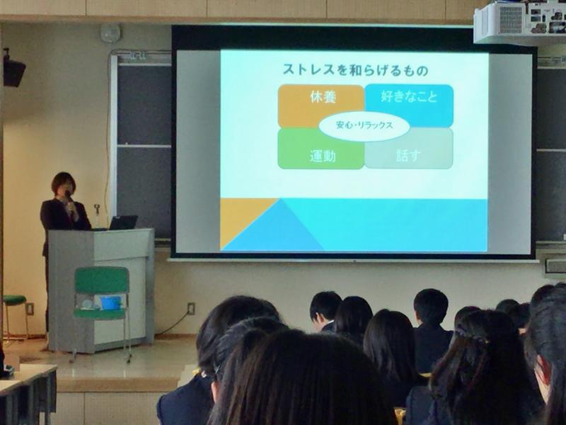 2学年対象にカウンセリング講話がありました。本校SC及川美香先生にご講演いただきました。生活の中でのストレスとのつき合い方をお聞きし、今後の生活に役立つ話を聞くことが出来ました。生徒達は、こころの体温計でストレス反応を測り、またそのストレスとうまくつき合うために自分なりの心のエネルギ ーチャージの仕方を確認することが出来ました。