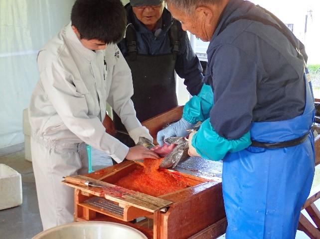 小泉さけふ化場の皆様にご協力いただき鮭の採卵、受精作業の体験をさせていただきました。生徒達は初めて行う体験ではじめは戸惑っていましたが、ふ化場の皆様の丁寧な指導もあり上手く採卵できた様でした。