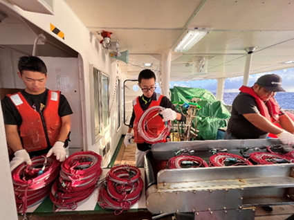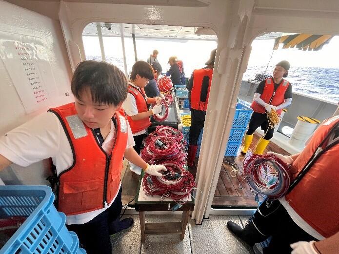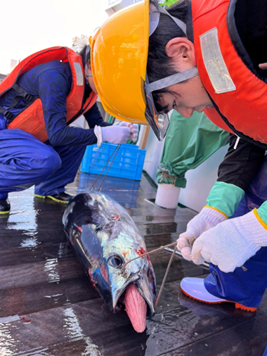 投縄で仕掛けた漁具を回収する揚縄作業では、漁獲された魚に持ち手を付け、魚の体長等の計測・記録を行います。