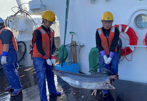 長期航海実習中の宮城丸では、19日よりマグロ延縄実習が開始されました。慣れない作業に戸惑いながらも一生懸命実習に取り組み仕事の大変さややりがいを感じているようです。