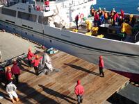 帰港後、気仙沼魚市場で水揚げが行われ、水揚げ後に商港岸壁で下船式を行いました。