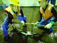揚げ縄作業では、生徒たちは漁獲物の体長・体重測定や幹縄の格納作業などを行いました。また、漁獲され、解体されたマグロやカジキを保管するマイナス60℃の急速冷凍庫に入り、その寒さを身をもって体験しました。