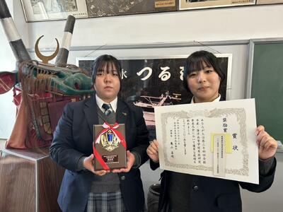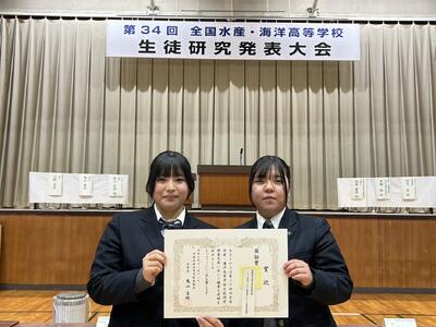 12月12日(金)に愛媛県立宇和島水産高校で開催された、第34回全国水産・海洋高等学校生徒研究発表会全国大会に産業経済科3年熊谷七海さん、藤田佳歩さんが出場し奨励賞を受賞しました。