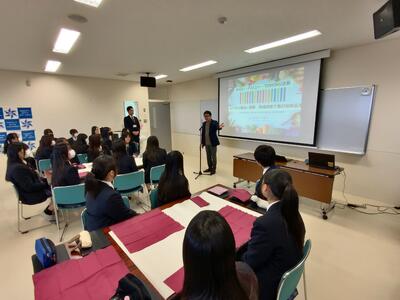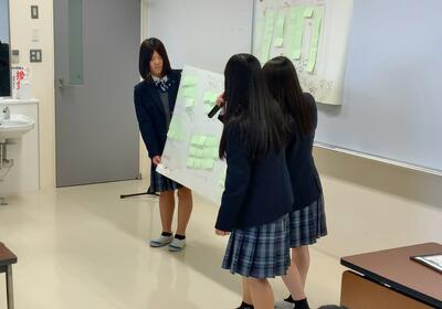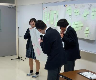 まとめの発表では、ユーモアあふれる高校生らしい商品名のアイデアが50件以上紹介されました。