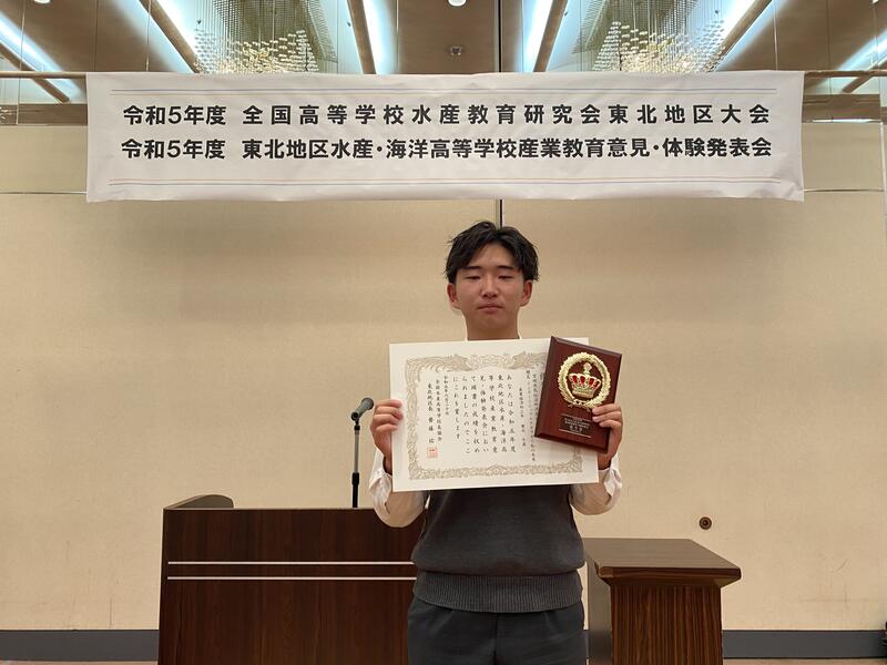 6月20日(火)、山形県鶴岡市で行われた全国高等学校水産教育研究会東北地区大会東北地区水産・海洋高等学校産業教育意見・体験発表会で本校産業経済科3年の軍司冬真さんが優秀賞を受賞しました。