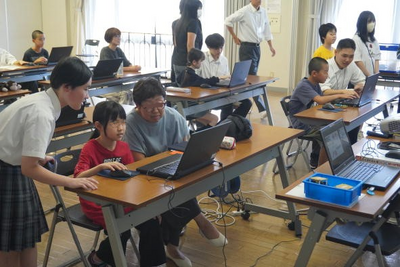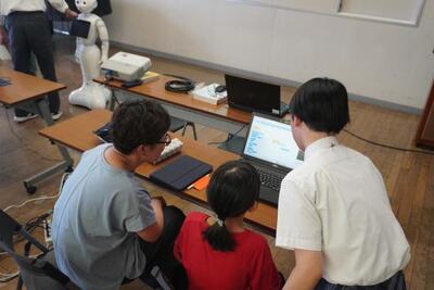 本校の生徒たちは、小・中学生8名に対して、マンツーマンでscratchソフトの使用方法やロボットの基本操作を教え、楽しく体験していただきました。