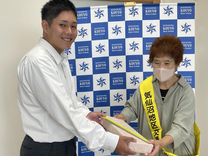 9月29日(月)、気仙沼地区交通安全協会様から、交通事故防止に向けた反射板の贈呈がありました。学校を代表して、本校生徒会長が1年生83人分の反射板とのぼり旗等を受け取りました。