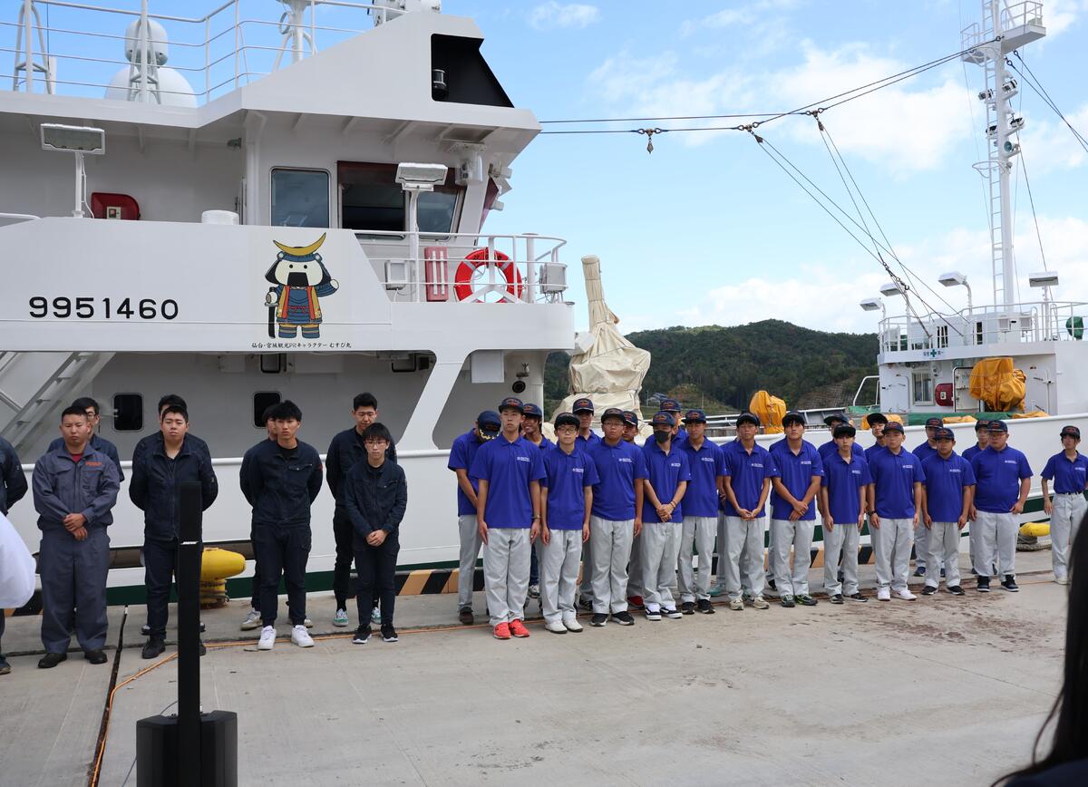 翌10月7日には、気仙沼港にて出港式が行われ、保護者・関係者・地域の皆様、全校生徒、教職員が出席しました。温かい拍手と声援に包まれながら、実習生たちはこれから始まる海での貴重な体験に胸を躍らせ、元気に出港しました。