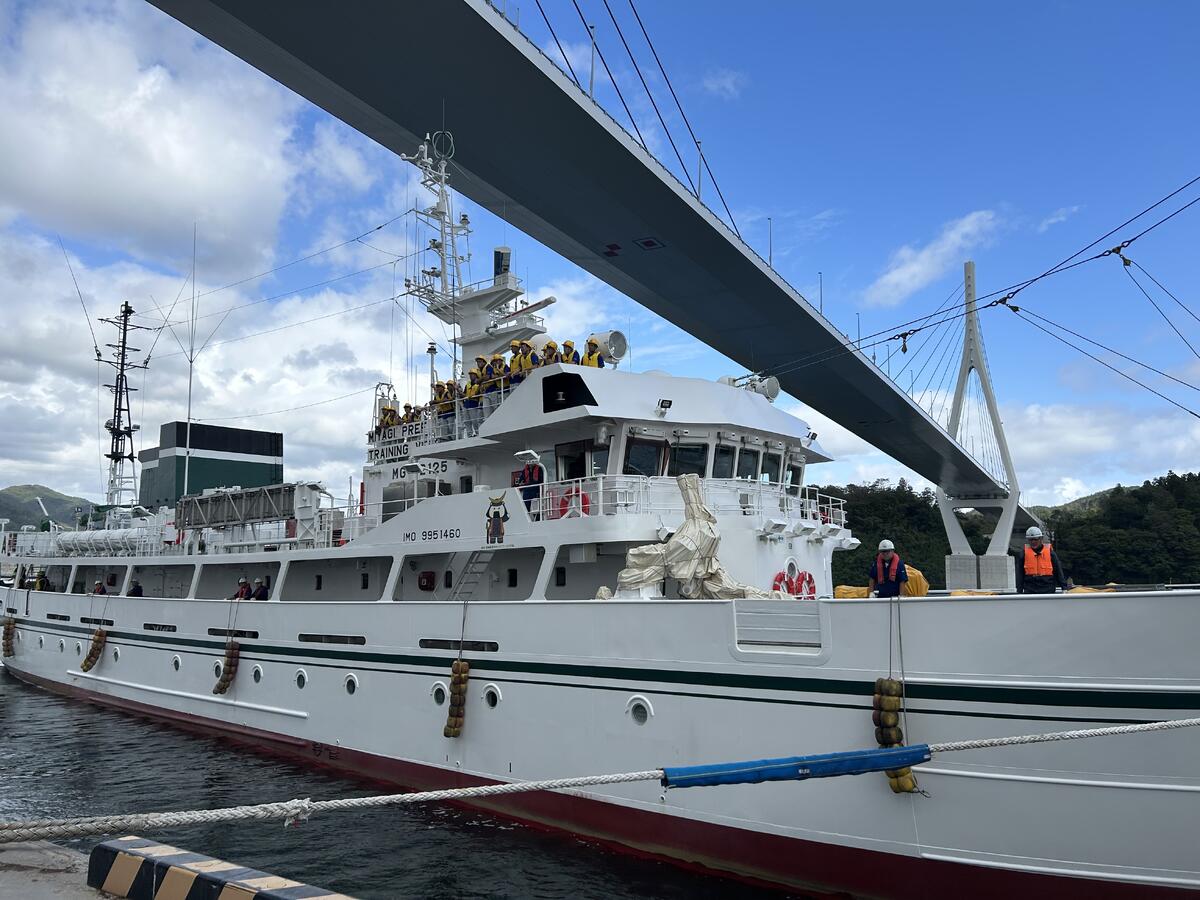 10月7日(火)、気仙沼向洋高校と宮城水産高校の生徒30人を乗せた、海洋総合実習船「宮城丸」が45日間のマグロ漁の実習のため気仙沼港を出港しました。