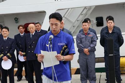 出港式では、乗船生徒を代表して武田太陽さん(情報海洋科2年・条南中)が「仲間と助け合いながら規律を守り、1つ1つの体験を大切にし、実りある実習にしていきたいと思います」と挨拶しました。