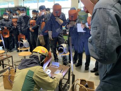5月30日(金)、機械技術科で「TlG溶接講習会」を実施しました。講師は、紫樹褒章を受賞している現代の名工、宮富士工業株式会社社長兼宮城県溶接協会会長の後藤様、溶接マイスターの高橋様、技能五輪出場経験のある東北発電工業株式会社の支倉様、菊田様の4名です。生徒39名は4班に分かれて、ステンレスやアルミの溶接について実践的な指導を受けました。