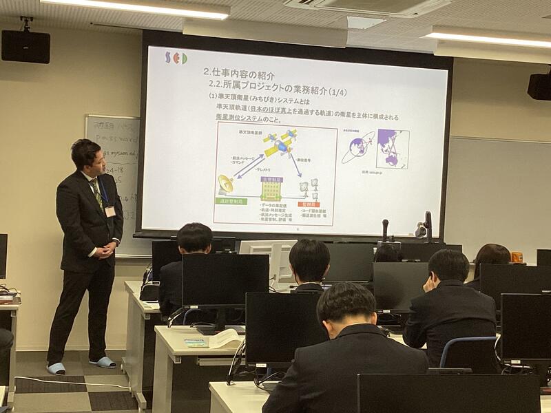宇宙技術開発株式会社からは、衛星・ロケットの開発、ロケット射場の整備、衛星管制業務など、宇宙を支える多様な業務について詳しくご説明いただきました。中でも、気象衛星「ひまわり」や準天頂衛星「みちびき」の管制に関する具体的な事例紹介は、生徒たちの関心を大いに引きつけ、将来の進路選択への意識を高める契機となりました。