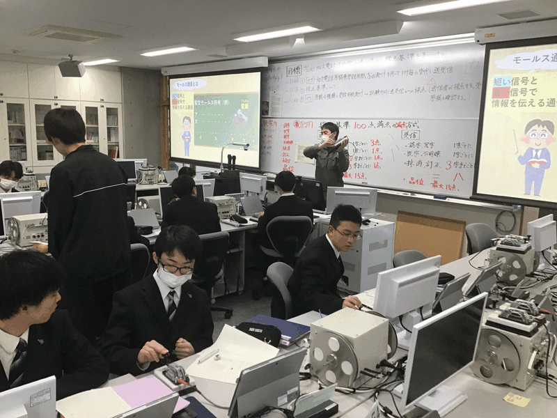 今回の授業では、モールス信号を使った通信体験を実施しました。実は、モールス信号を実際に学べるのは宮城県内でも本校ならではの取り組みです。