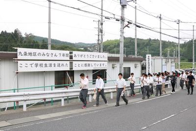仮設校舎建設のためにお力添えを頂いた皆様や,本校の教育活動を温かく見守ってくださった地域の皆様,これまで本当にありがとうございました。8月24日から,階上地区に建築していただいた新校舎での学校生活が始まります。この九条校舎時代に頂いたご厚情を忘れずに,新校舎でも頑張ります。