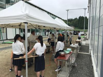閉校舎式を行った後で,地域の皆様への感謝事業として,通学路周辺の清掃活動と通学路周辺の皆様へのサンマ缶詰の贈呈,そして清掃活動やサンマ缶詰贈呈で出かけたグループのために,生徒による炊き出しを行いました。