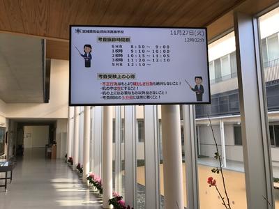 新校舎落成記念事業実行委員会より,教育環境整備事業としてサイネージ(校内情報掲示システム)を設置していただきました。校内5カ所に設置された大型ディスプレイをとおして,行事予定や時間割変更など,校内で生徒・教職員が共有したい情報を表示するシステムとなっております。有効活用させていただき,よりよい教育環境の構築を目指します。