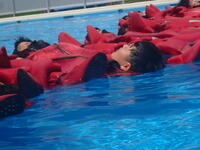 7月6日(木)、情報海洋科海洋類型3年生がイマーションスーツ着衣訓練、裏返った膨張式筏を元に戻して乗り込む訓練など海上における救命訓練を行いました。