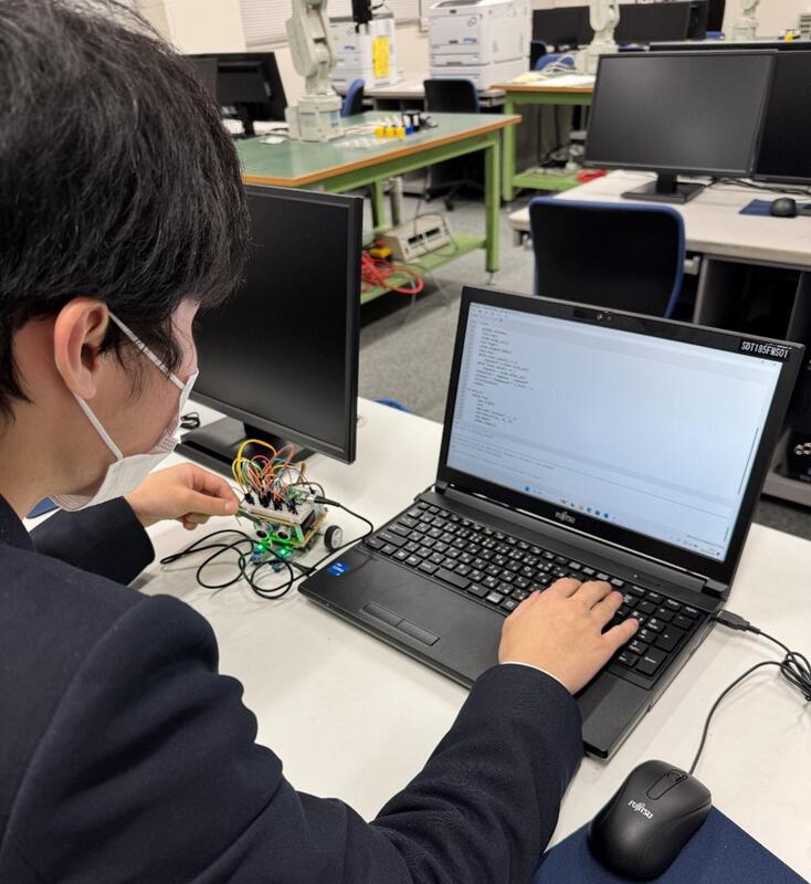 2年からの実習は、電子機械に関する実習は共通で、生産技術類型では機械加工を重点的に、情報技術類型ではプログラミングを重点的に学習します。